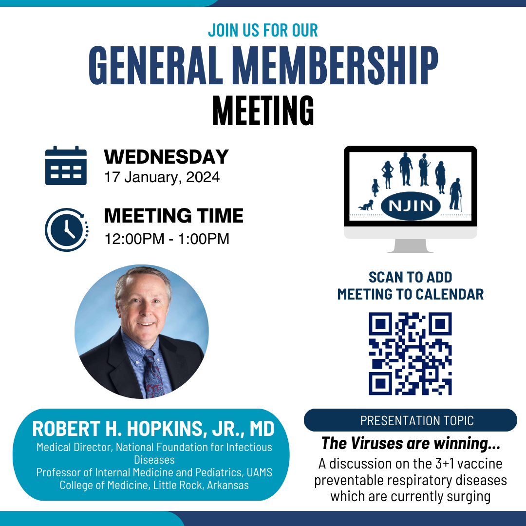 Dr. Robert H. Hopkins, Jr. will be giving a presentation during NJIN's first General Membership meeting of 2024 on January 17th at 12:00pm. The presentation, titled “The Viruses are winning…,” will focus on RSV, COVID and flu. Slides are available upon request. | |