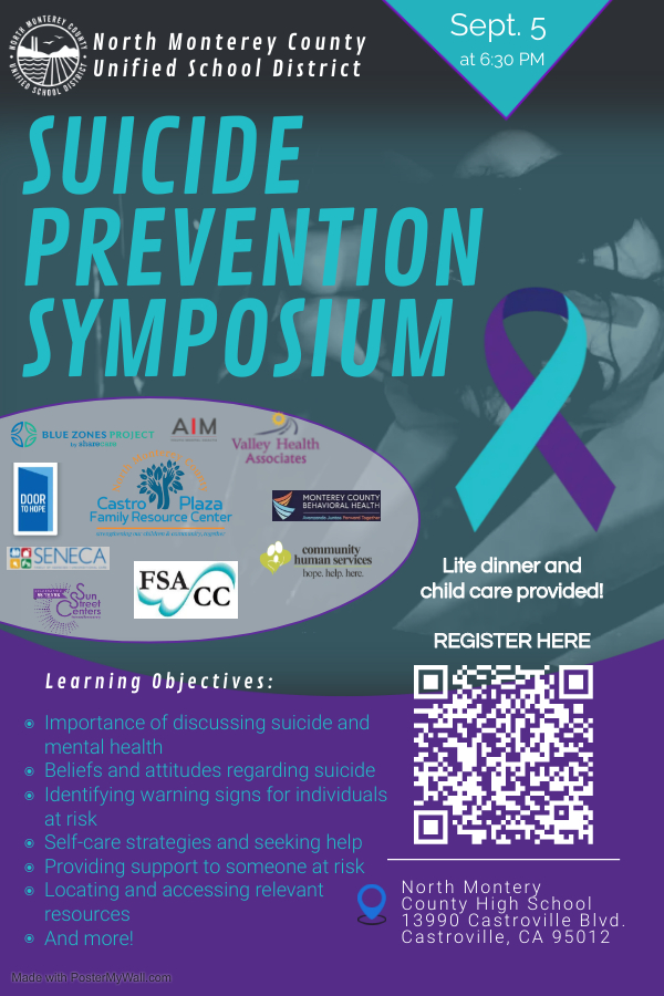 In an effort to provide comprehensive support, North Monterey County USD is proud to collaborate with the Family Service Agency of the Central Coast, who will be conducting a powerful presentation at the Suicide Prevention Symposium today, Tuesday, September 5, 2023. This event is open to the public and completely free of charge, offering not only valuable insights but also refreshments and additional support services.