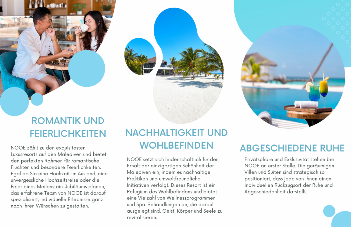 Inmitten der paradisischen Malediven gelegen, baut die Heimatinsel dieses Hotels auf natürliche Schönheit gepaart mit zeitloser Eleganz. Wir freuen uns, in diesem Newsletter die wichtigsten Verkaufsargumente für NOOE und einige der Resort-Highlights präsentieren zu dürfen.