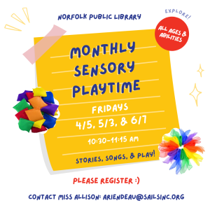 Join Miss Allison for stories, songs, and play! Children and their caregivers will spend 20-25 minutes enjoying songs, rhymes, and stories, followed by 20 minutes of sensory play (i. e. sensory bin play stations, a simple craft, or coloring).