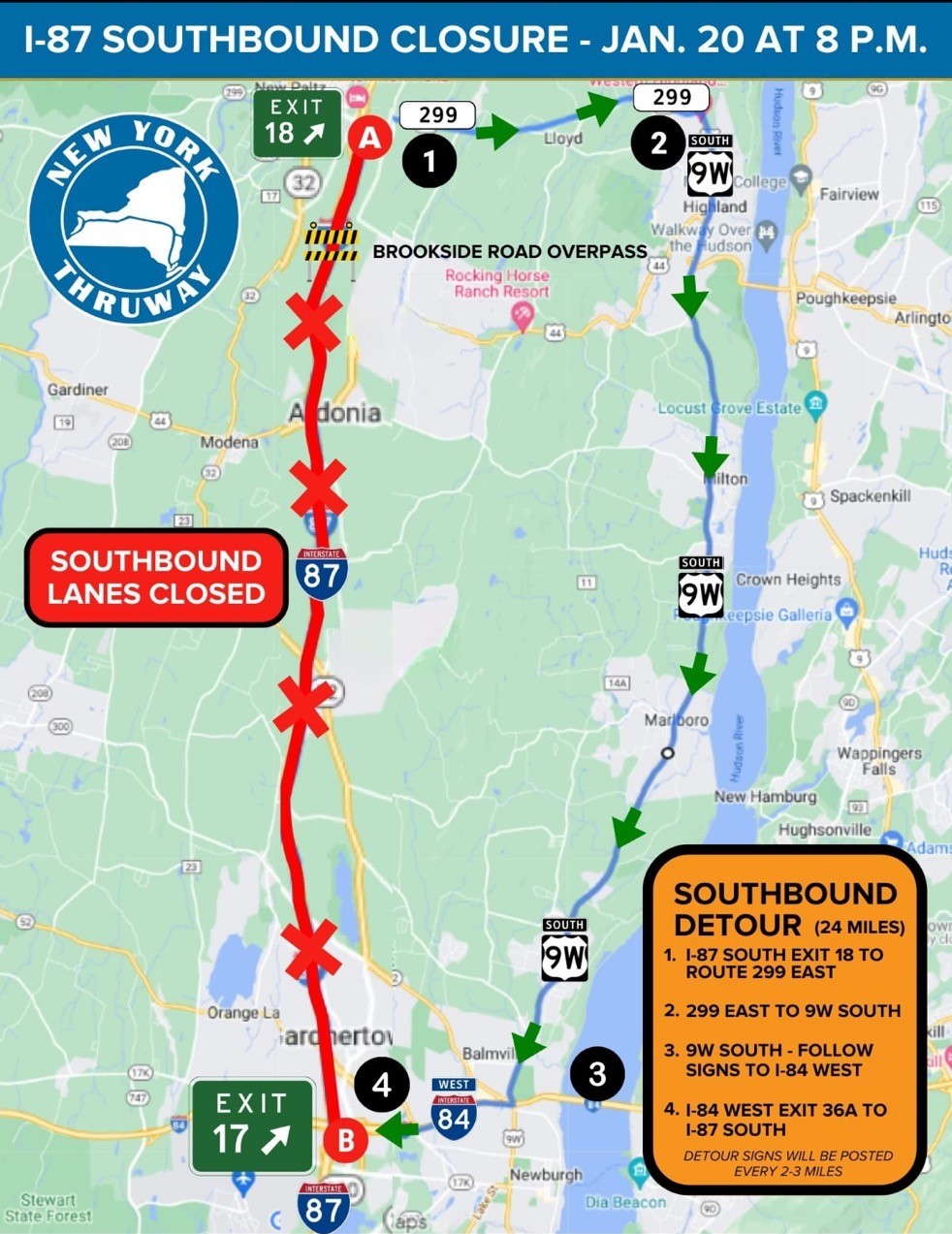 ⚠️ HUDSON VALLEY TRAFFIC ALERT - I-87 SOUTHBOUND CLOSURE THIS WEEKEND: The southbound lanes of the Thruway (I-87) from exit 18 (New Paltz) to exit 17 (Newburgh) will fully shut down to all traffic at 8 p.m. Saturday, Jan. 20, for at least 12 hours so contractors can safely remove the damaged Brookside Road overpass over the southbound lanes, weather permitting. The section of overpass above the northbound lanes was successfully removed this past weekend.