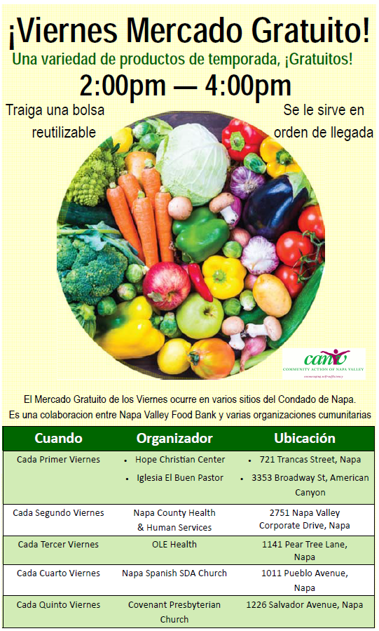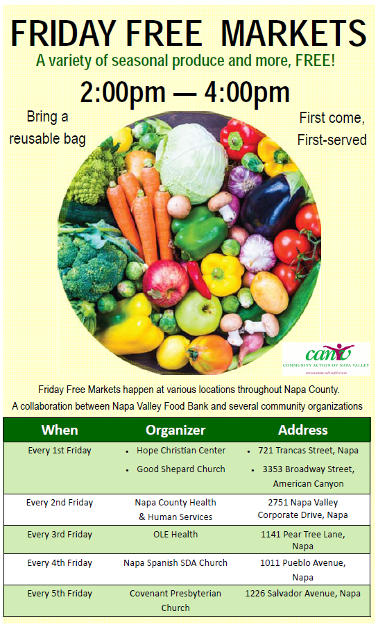 On the 2nd Friday of each month Napa Valley Health and Human Services Agency (in partnership with Community Action of Napa Valley, CANV) hosts a Free Market, with a variety of seasonal produce, OPEN TO EVERYONE at our South Campus location, In front of Building “B” (2751 Corporate Drive, Napa, CA 94558). There are no eligibility requirements, but it is first-come first-serve. Please Bring a Reusable Bag. Call (707) 253-4279 for more information or visit the