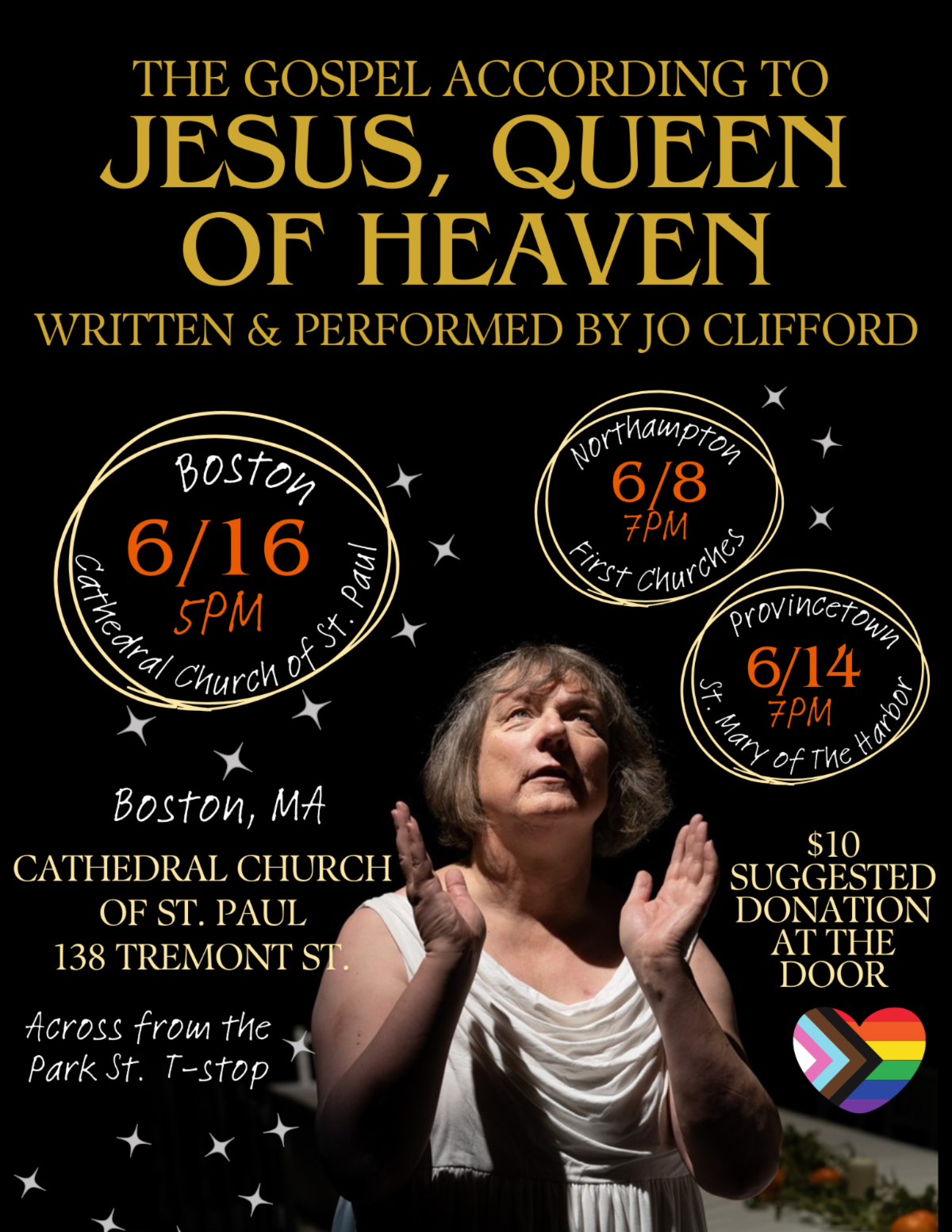 Jo Clifford is an award-winning playwright, translator, poet and performer who travels to us from Scotland to share her message of divine and human compassion and love. Jo has written more than 100 plays, many of them performed all over the world, including the Edinburgh Fringe Festival, for over 50 years. The Gospel According to Jesus, Queen of Heaven, first performed in 2009, has been translated into 7 languages and performed in 9 countries worldwide. This tour is the first time Jo has performed as Queen Jesus in the US, with performances in Northampton, Boston and Provincetown.