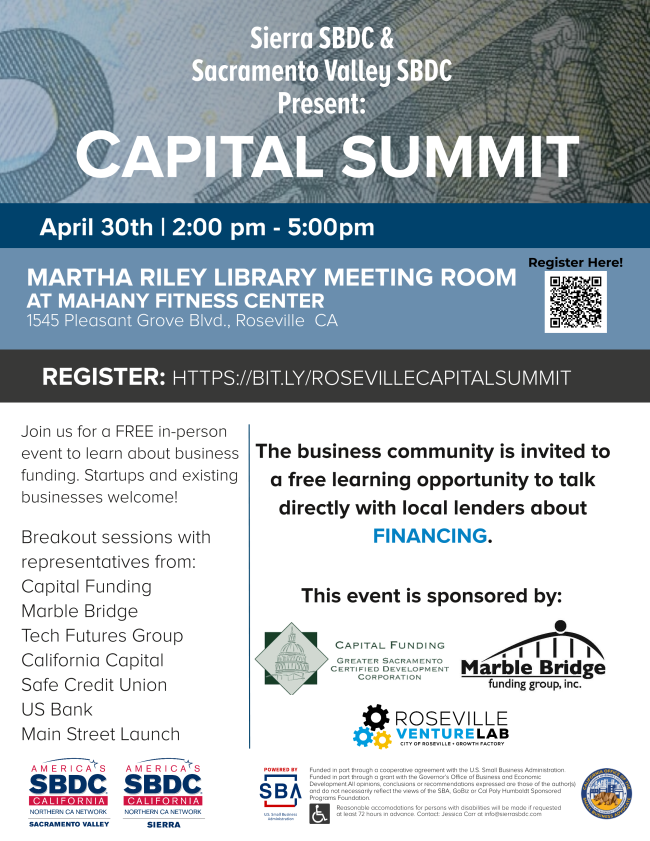 Sierra Small Business Development Center Capital Summit, April 30.