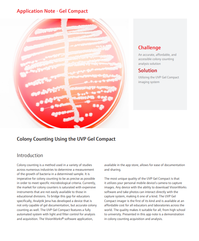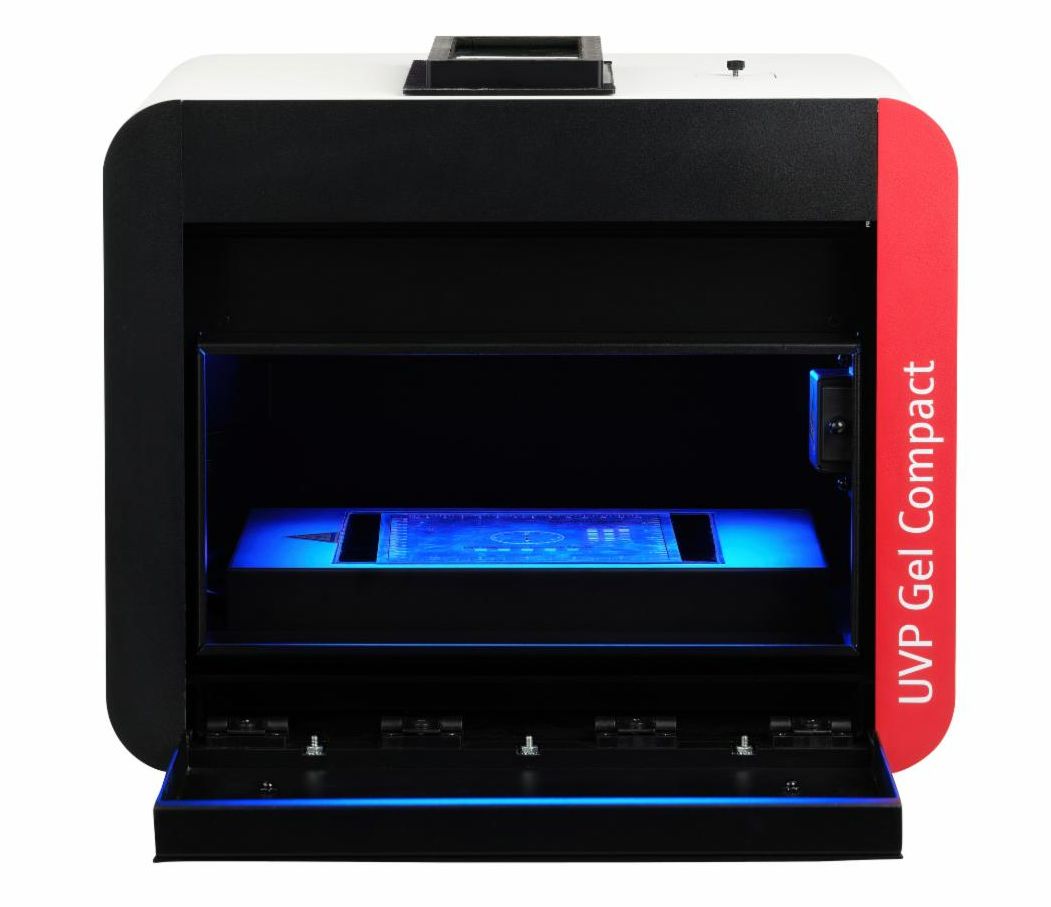 The UVP Gel Compact imager is an autonomous, independent, and cellphone-driven bioimaging system designed for the documentation and analysis for various types of samples which include but are not limited to DNA gels, protein gels, and colony plates, etc. The UVP Gel Compact allows users to capture images and analyze them via their personal mobile device equipped with Analytik Jena's VisionWorks Software App. The new VisionWorks application was generated for easy gel capture and analysis and allows for total control of the UVP Gel Compact darkroom. The system features a 302 nm wavelength transilluminator, overhead white and blue LEDs, and phone holder/adapter that can accommodate most phone sizes on the market.
