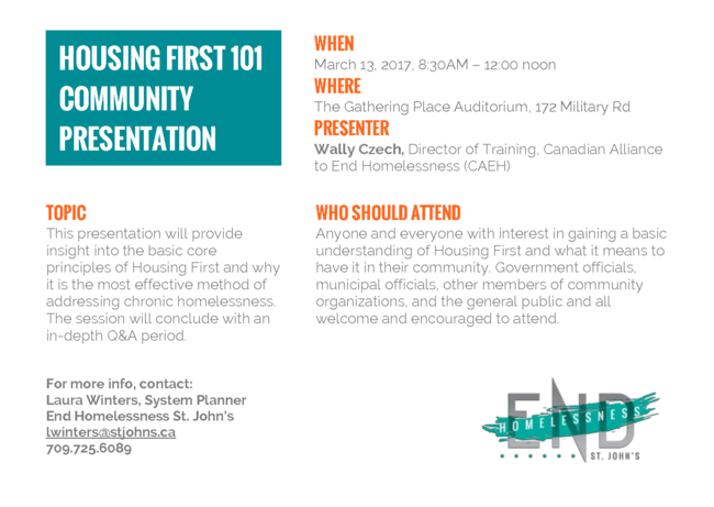WHO SHOULD ATTEND: Anyone and everyone with interest in gaining a basic understanding of Housing First and what it means to have it in their community. Government officials, municipal officials, other members of community organizations, and the general public and all welcome and encouraged to attend.