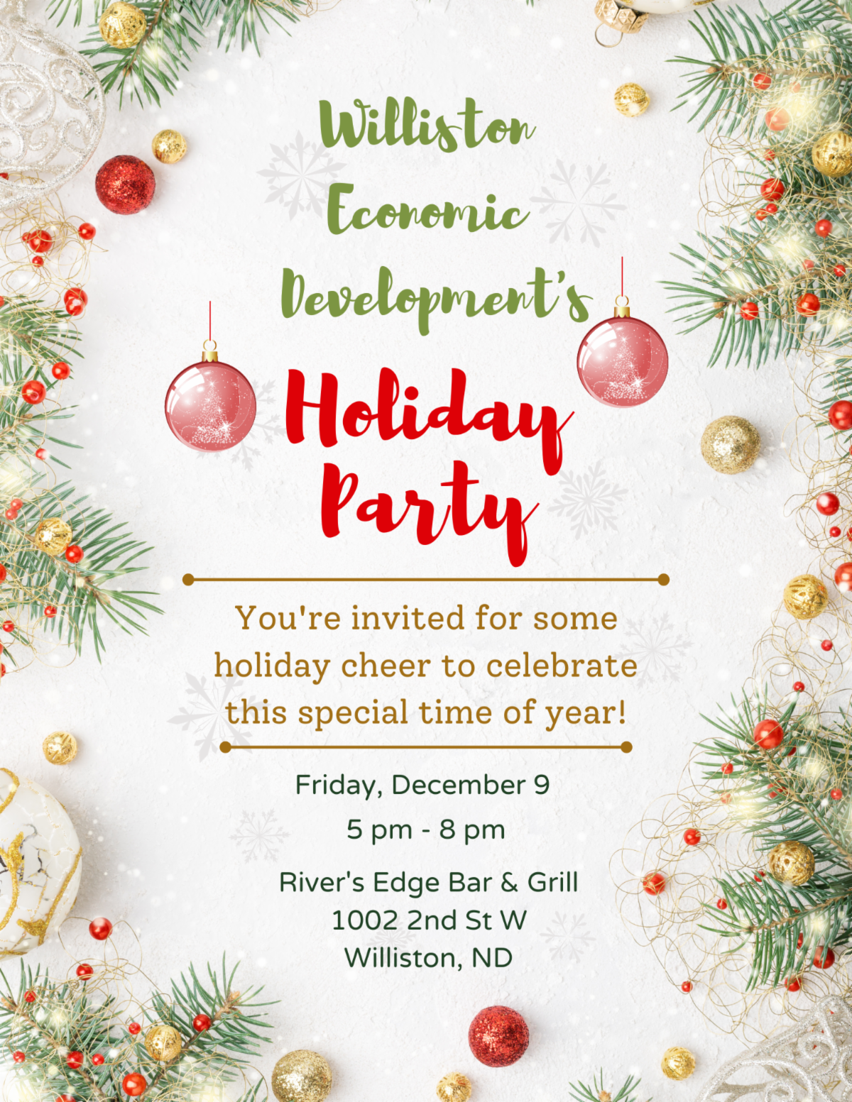 Mark your calendars, Williston Economic Development's annual holiday open house will be held Friday, December 9th at the River's Edge Bar & Grill. The annual celebration will be held from 5-8 p.m. There will be complimentary appetizers, door prizes, live music, and networking. We hope to see you there!