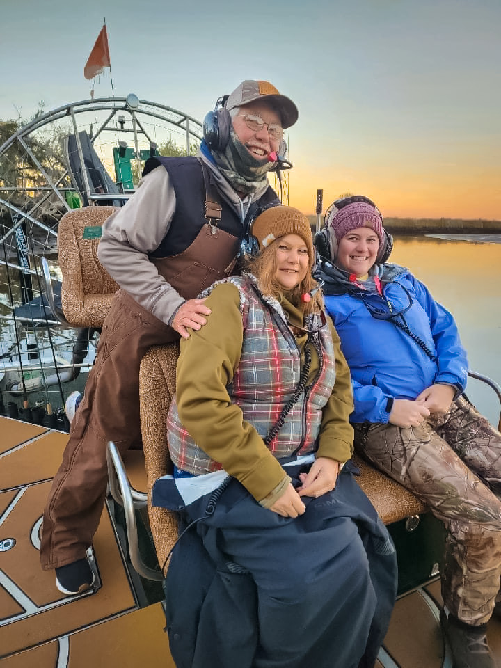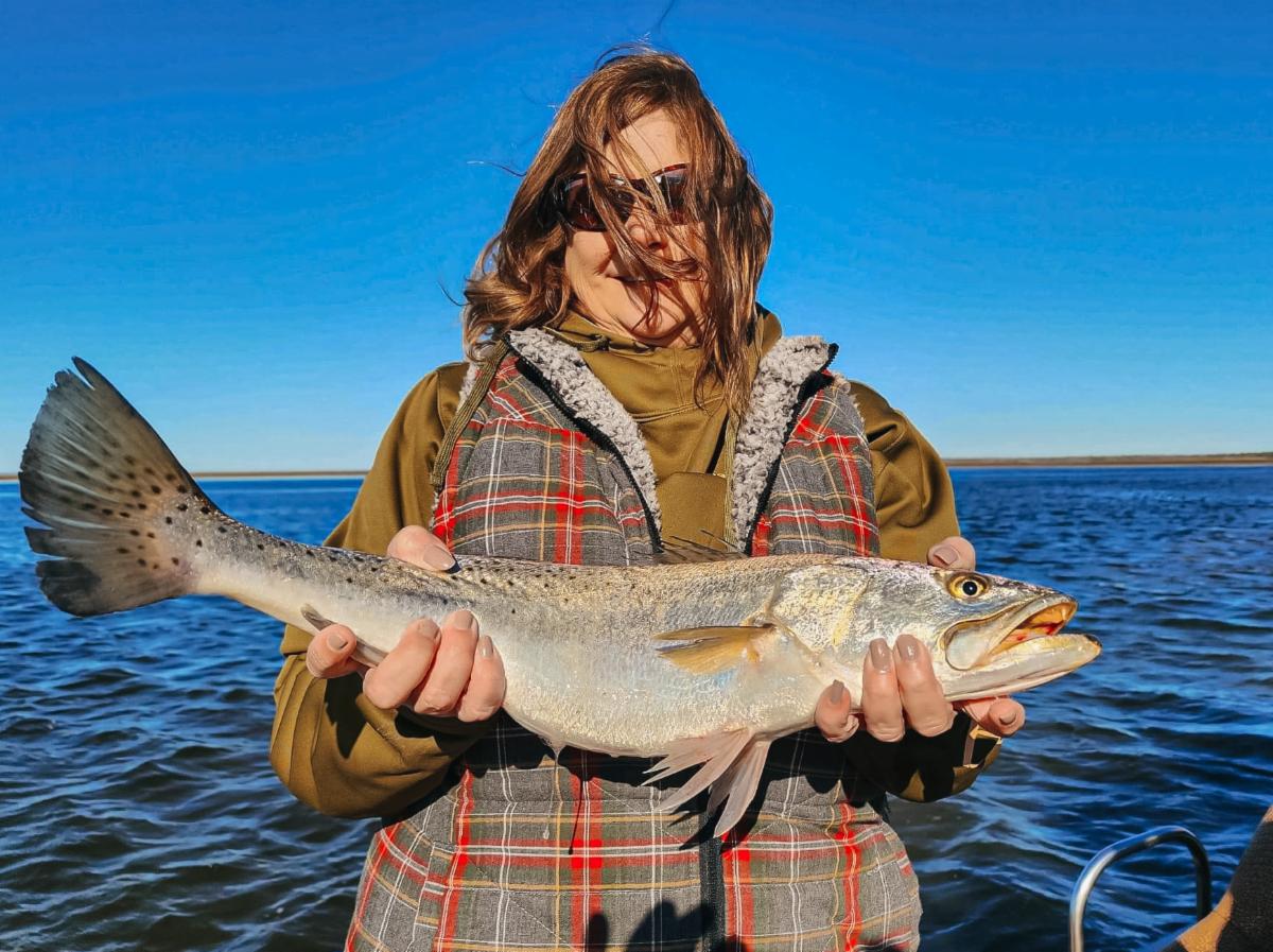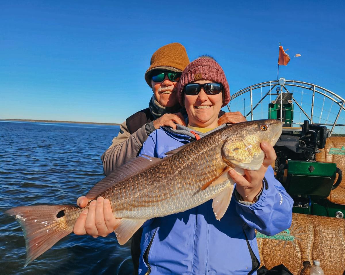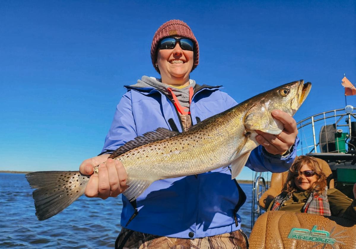 | Tammy Stemple with her birthday trout! | Brenda Jackson caught a 25in trout while fishing aboard Capt. Randy Harris' airboat. | Capt. Chase Norwood captured this photo of his Razorcat heading out at sunset! | Toni reeled in a gorgeous redfish with her dad, Capt. Tony Jackson. | Little Miss Lincoln is modeling her Sea Hag onesie and Heart of Hatchee beanie! All available for purchase at Sea Hag Marina! | |