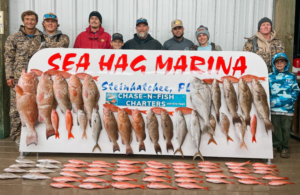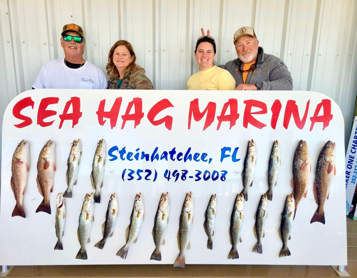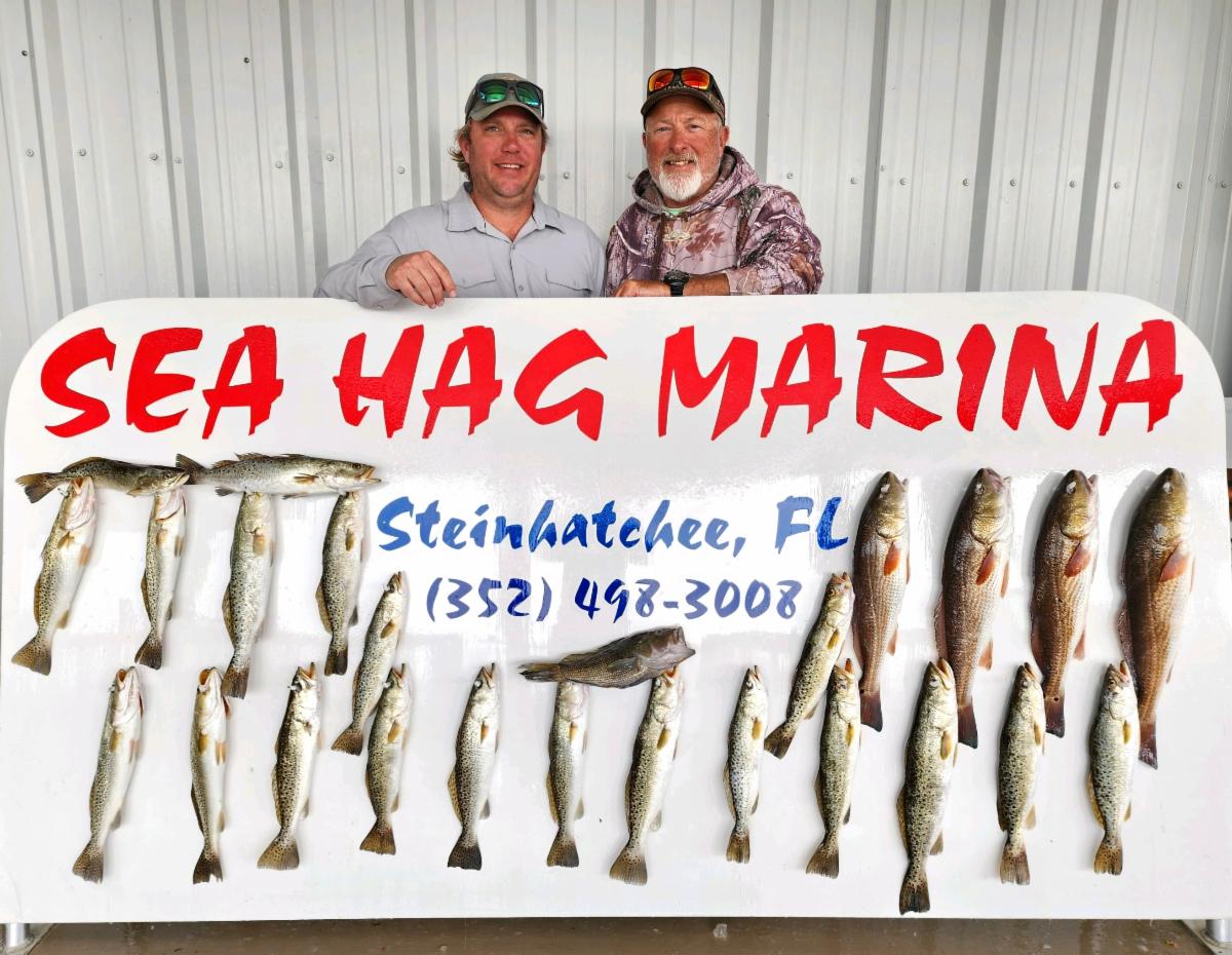 Trevor landed this big ol' gator trout with Capt. Randy Harris. | Toni, the daughter of Sea Hag charter captain, Tony Jackson, went fishing for the first time on an airboat and landed this massive trout. | Capt. Tony Jackson said it was so much fun getting to treat his daughters to an airboat ride & fishing trip! | The Jackson crew filled the board up with redfish & trout after their trip with Capt. Randy Harris. | During the Bullock Crew's trip aboard the Chase N Fish Vessel, they caught a 15lb+ porgie! | Capt. Chase Norwood is holding up the big ol' fish! He said it's one of the largest porgies he's ever seen. | Trevor doubled up on a trout & redfish during his trip with Capt. Randy Harris. | The two, Trevor & Randy, definitely had a wonderful day of fishing! | Roy, Lynn & Roger caught some serious quality fish with Capt. Randy Harris. | Check out their trout! Capt. Randy Harris said it was great getting to take these three retired FWC officers out for a day of fun on the water. | Capt. Chase Norwood said that SPRO jigs have been hot right now with red grouper! | Ryan Best caught & released a massive gag grouper with Capt. Chase Norwood. | Benelli, the Sea Hag dog, was enjoying the pink sunset at Sea Hag Marina the other night! | Kathi Kretzer & Lee Sayler enjoyed a day of catching their limit of trout with Capt. Kyle Skipper! | Save the date! The annual Fiddler Crab Fishing Tournament is set for February 18th, 2023! | |