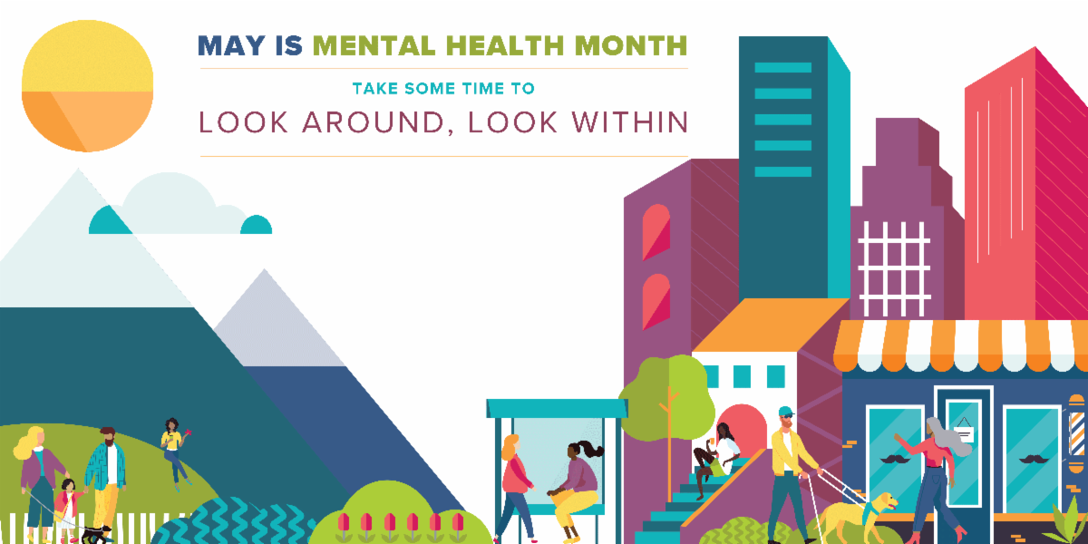 [Image description: At the top, text says "May is Mental Health Month. Take some time to Look around, look within." Below the text, a series of colorful illustrations depict the skyscrapers, mountains, shops, and several groups of people doing various activities like walking dogs and speaking with each other.] | Mental Health Awareness Month | |