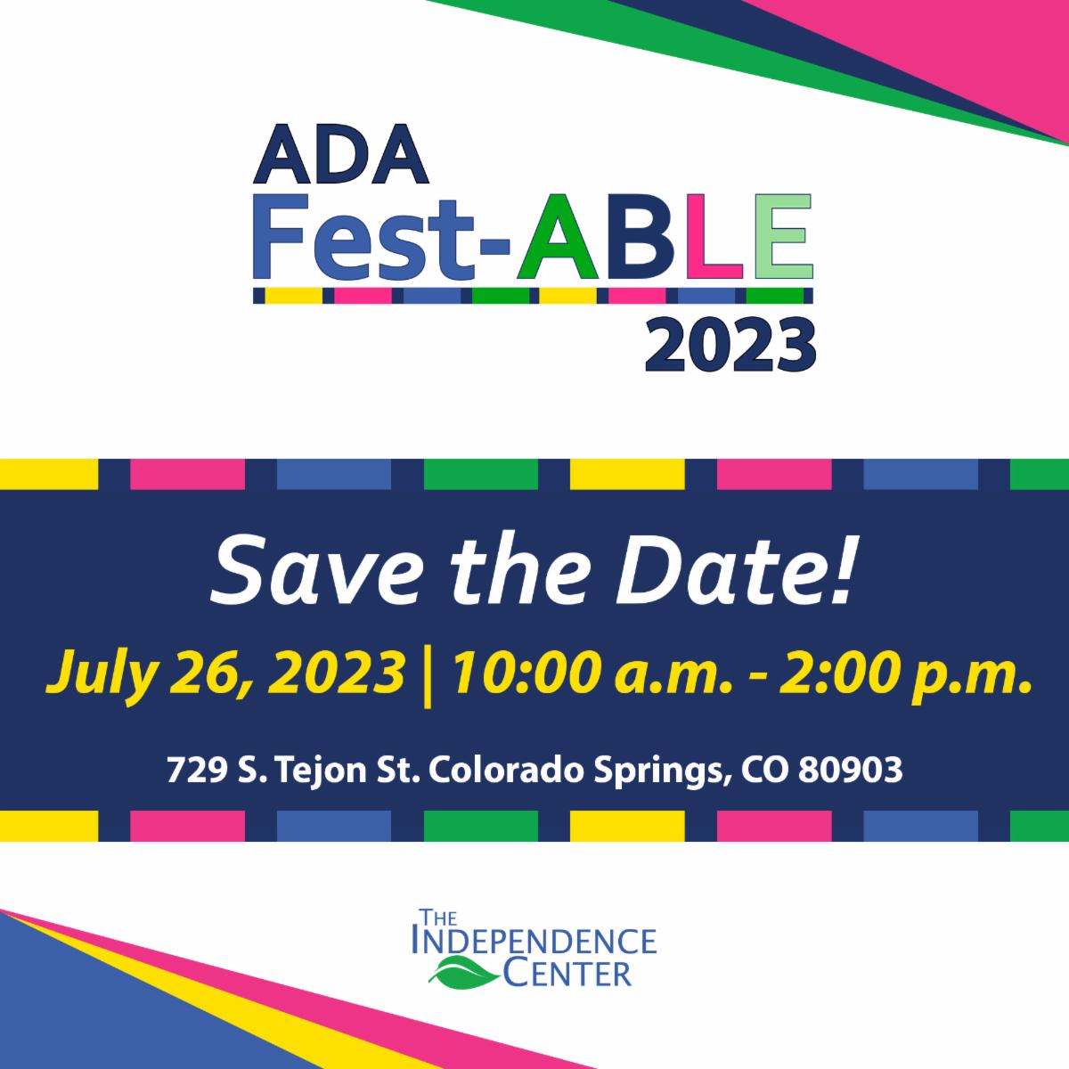 [Image description: The colorful Fest-ABLE logo above the words "Save the Date! July 26, 2023, 10:00 a.m. - 2:00 p.m., 729 S. Tejon St. Colorado Springs, CO 80903." The IC's logo is underneath. ]