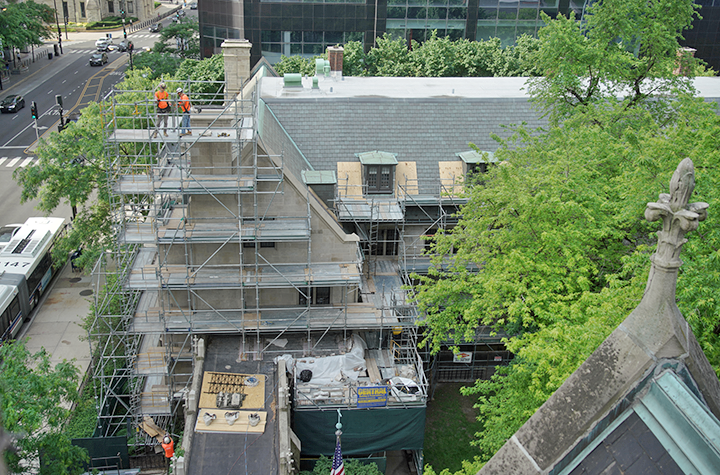 In this photograph taken from the steeple, workers (in upper left and lower left) can be seen dismantling the scaffolding around the Manse as this year’s phase of stonework and tuckpointing begins to wind down. | |