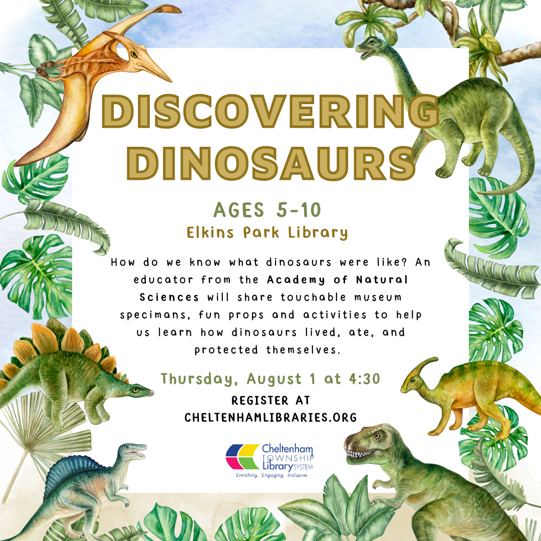 An educator from the Academy of Natural Sciences will share touchable museum specimens, fun props, and activities to help us learn how dinosaurs lived, ate, and protected themselves. For ages 5 to 10. Registration required.