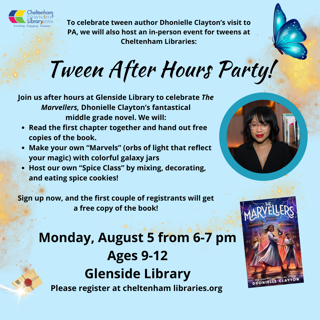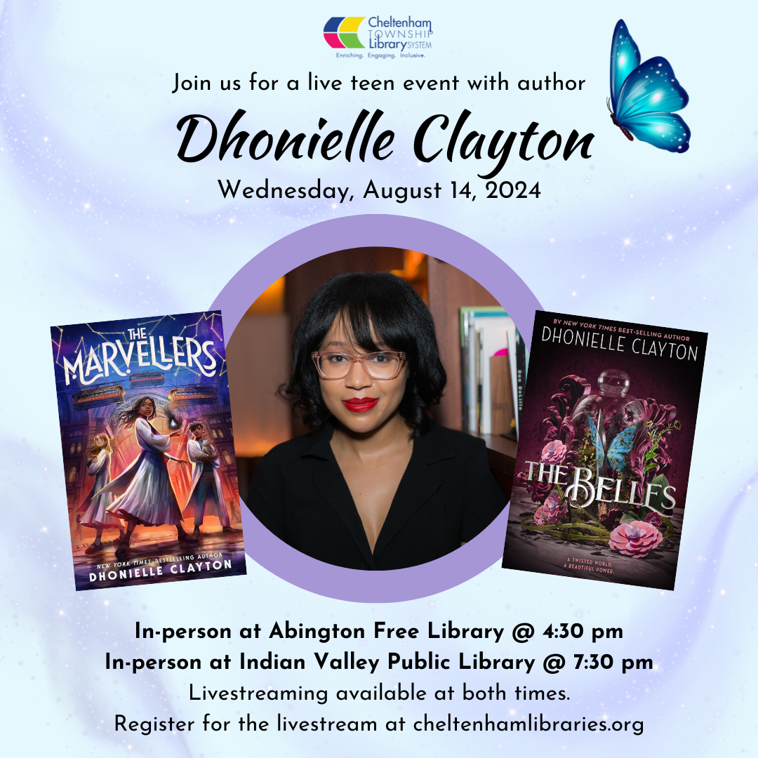 Watch a livestream of a renowned tween & teen author Dhonielle Clayton talk about writing tween fantasy like The Marvellers and teen novels like The Belles. See her live at Abington Library at 4:30 pm or Indian Valley Public Library at 7:30 pm, or watch a live stream at home! Ages 8 to 18. REGISTRATION REQUIREMENTS online.