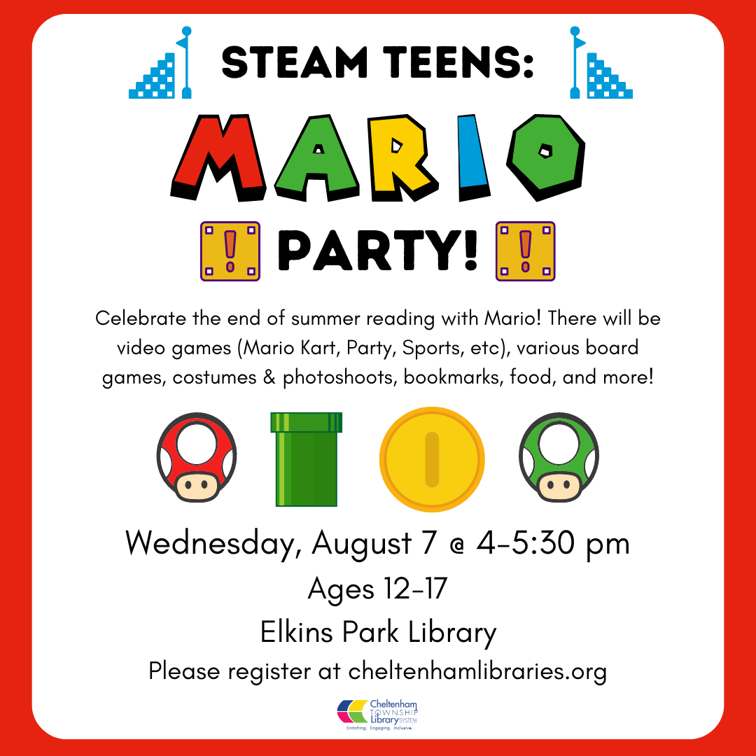 Join our party based on the #1 video game character! There will be Mario Party (obviously), Mario Kart, Smash Brothers, board & card games, costumes, food, and more! Ages 12 to 17. Registration required.