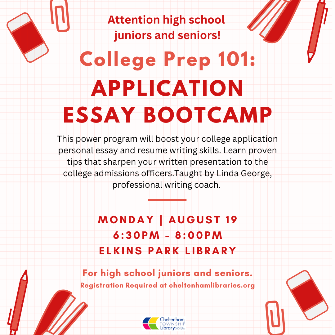 This power program will boost your college application personal essay and resume writing skills. Learn proven tips that sharpen your written presentation to the college admissions officers. Taught by Linda George, professional writing coach. For high school juniors and seniors. Registration required.