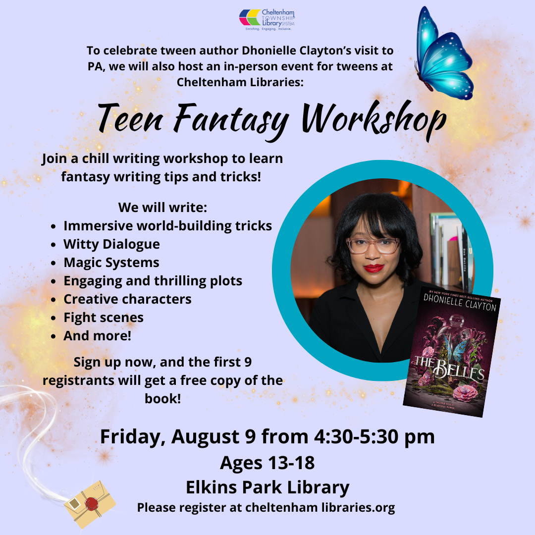 Join a chill writing workshop to learn fun fantasy world-building and writing techniques, watch a video essay, and eat spice cookies. Attendees will get free copies of The Belles by Dhonielle Clayton in anticipation of her visit. Ages 13 to 18. Registration required.