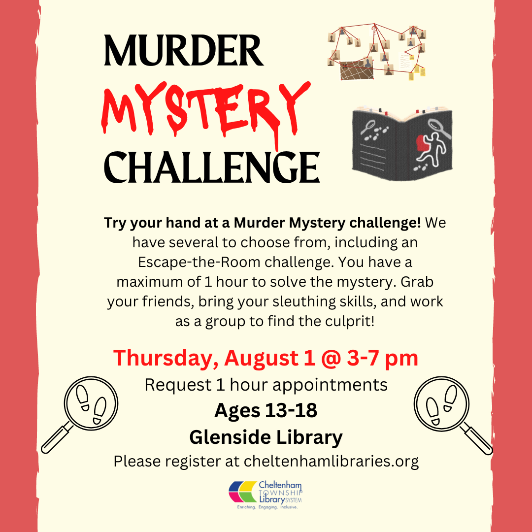 August 1 @ 3:00 - 7:00 PM: Murder Mysteries. Try your hand at a Murder Mystery challenge! We have several to choose from, including an Escape-the-Room challenge, so grab your friends and get to sleuthing! Ages 13 to 18. Registration required.