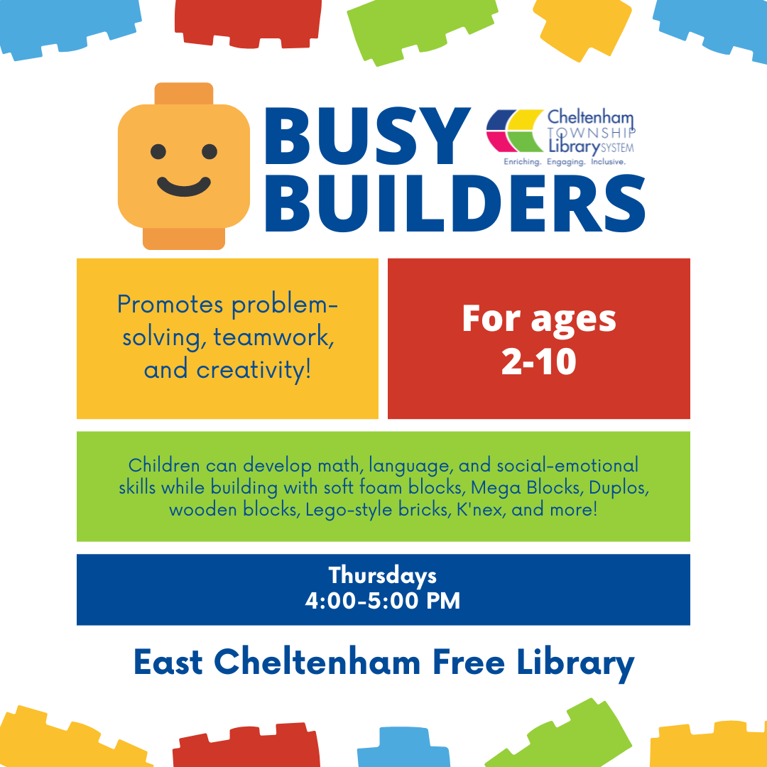 Develop math, language, and social-emotional skills while building with soft foam blocks, Mega Blocks, Duplos, wooden blocks, Lego-style bricks, K'nex, and more! For ages 2 to 10.