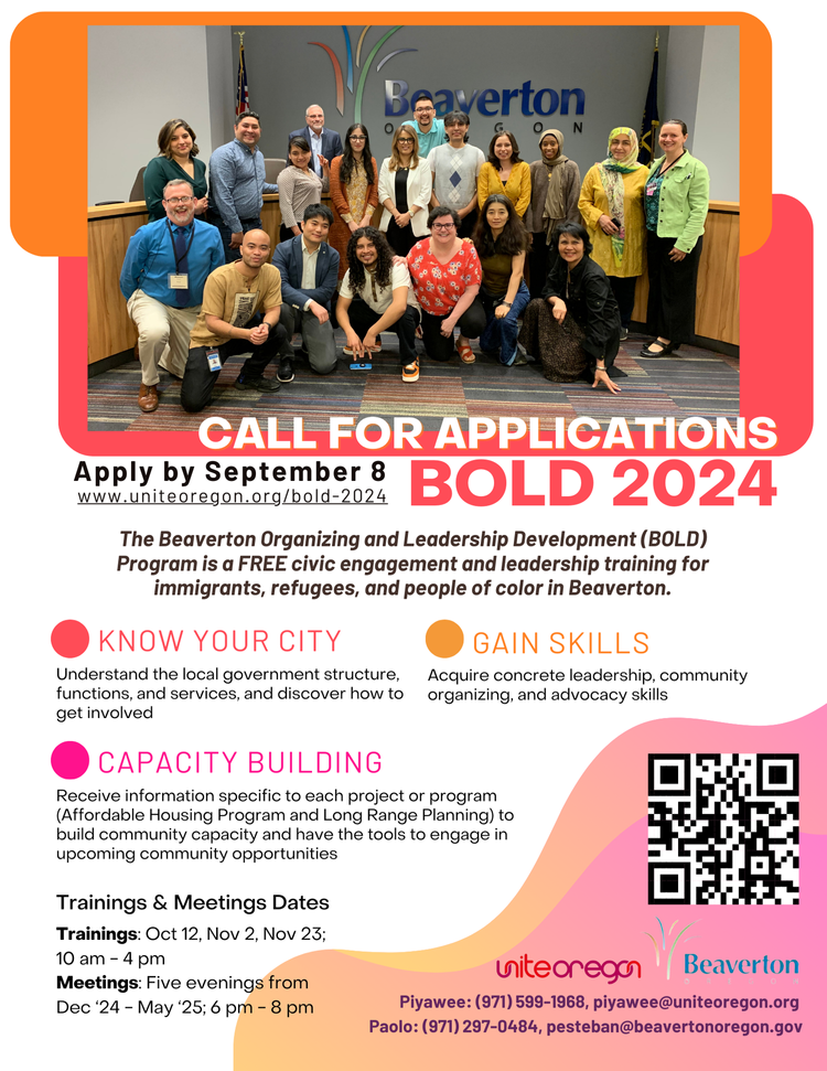 Applications for the upgraded BOLD (Beaverton Organizing and Leadership Development) Program 2024 are now open! The BOLD Program is a free civic engagement and leadership training for immigrants, refugees, and people of color in Beaverton. It offers participants valuable skills in organizing, advocacy, and civic engagement, empowering participants to make positive changes in their communities. This new iteration of the program includes a special element of community engagement with Beaverton’s Community Development Department staff. Participants will have opportunities to learn about Beaverton’s programs and provide valuable feedback. This program is funded by the City of Beaverton and is open to Beaverton residents, as well as non-residents who have a strong connection to the city.