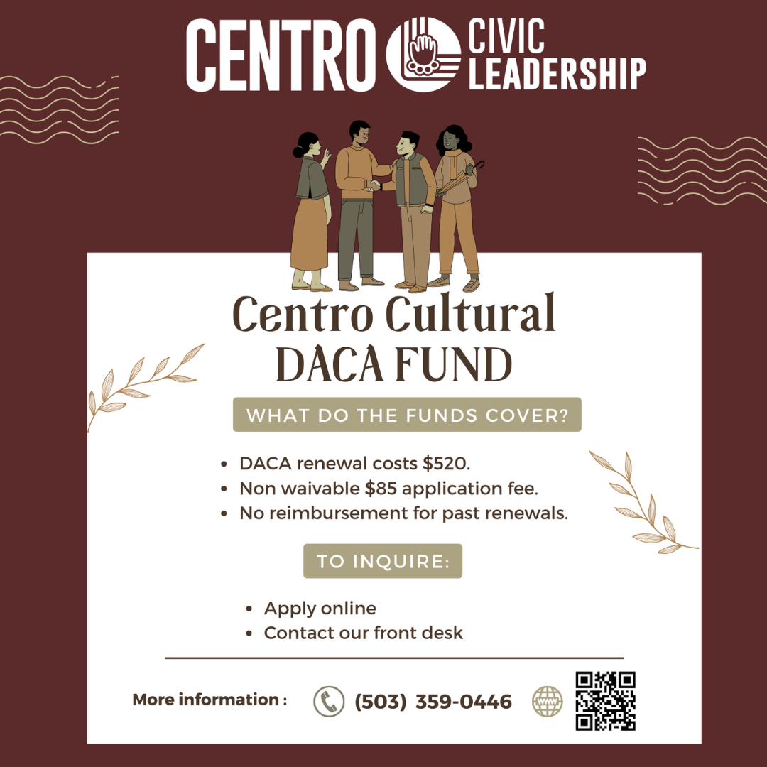 Centro invites Oregon DACA recipients to apply for this scholarship fund to renew your DACA status. The financial assistance program covers the $605 needed for processing and renewal fees. The process is completely confidential and open to everyone who needs to renew their DACA status and reside in the State of Oregon. For more information or questions call: 503-359-0446.