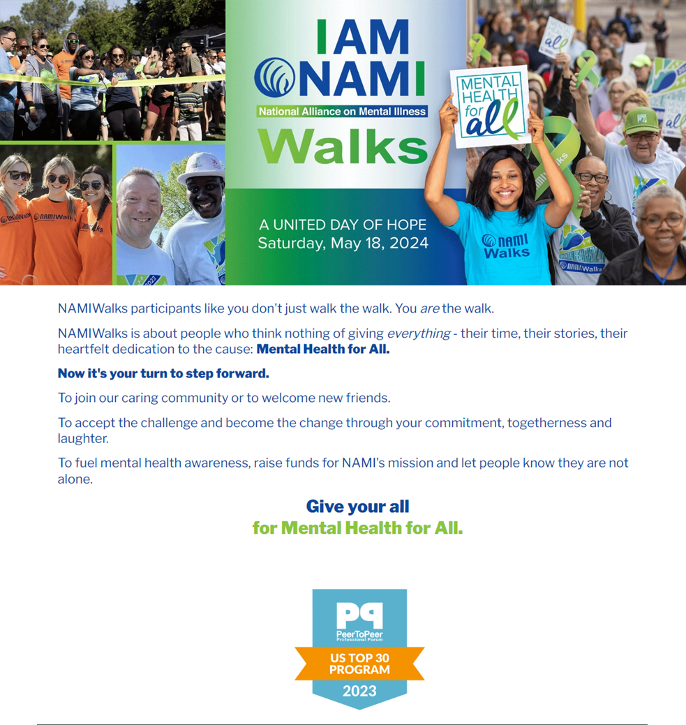 To raise awareness and funds for mental illness, NAMIWalks will be held on Saturday, May 18, 2024 at Perimeter Park in Morrisville, NC. Faith Connections on Mental Illness is currently the top fund raiser.