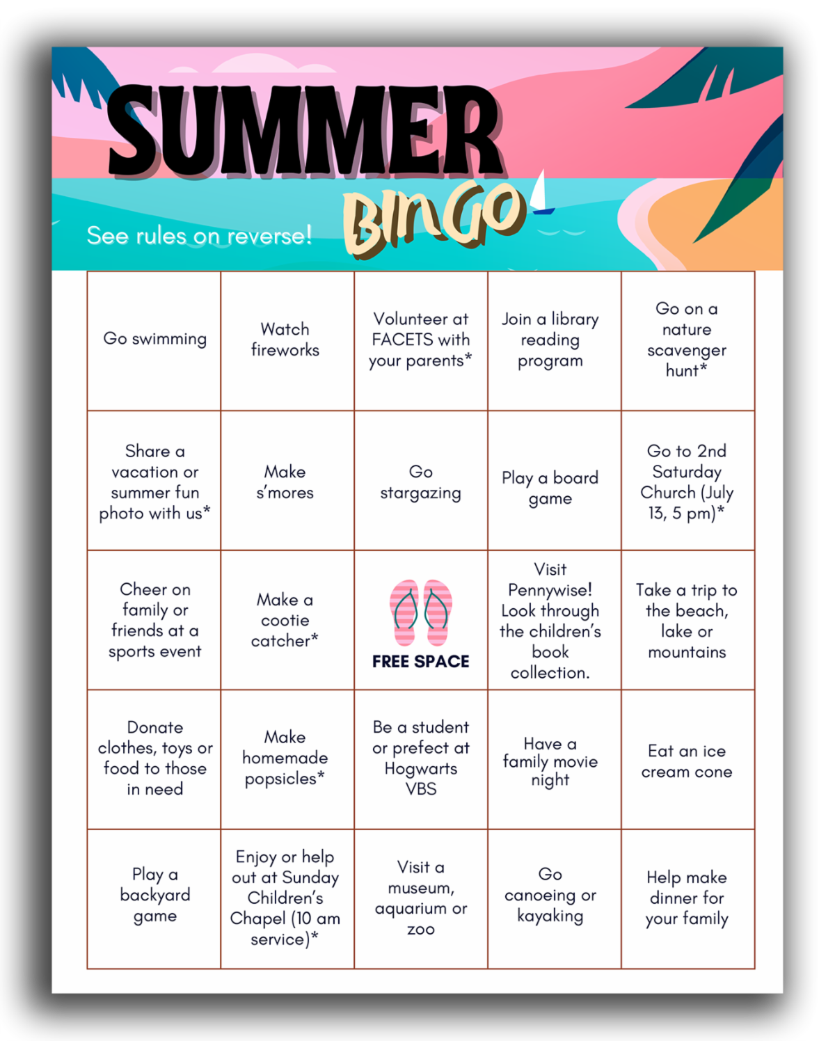 Stop by our Children's Ministries table to pick up a Summer Bingo card to play with your family. It's a treasure hunt, a game, and a challenge all rolled into one. You can also access the game HERE or by clicking on the bingo card. Prizes available for all "five in a row" winners, and you can play as many times as you want.