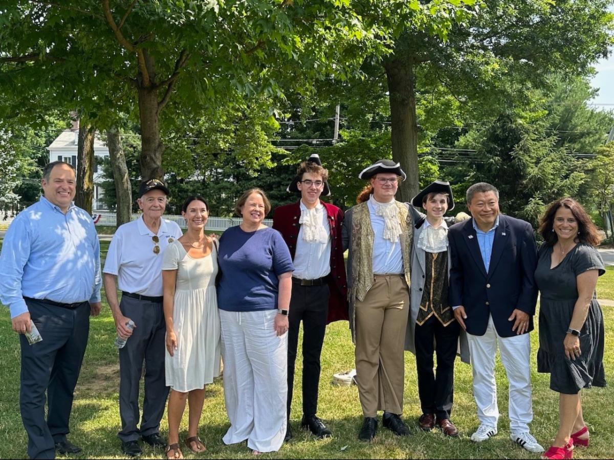 From left, First Selectman Bill Gerber; Keynote Speaker Thomas A. McHale, Lt. Col., U.S. Army, Retired; State Representatives Jennifer Leeper and Sarah Keitt; John Adams (Liam Cadavid); Thomas Jefferson (River Peterson); Benjamin Franklin (Stephen Petrosino); State Senator Tony Hwang;