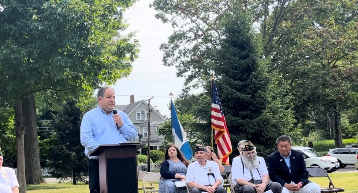 Fairfield celebrated Independence Day on the Town Hall Green with a ceremony organized by the United Veterans Organization and supported with refreshments by the Daughters of the American Revolution. Emcee Roger Moscater welcomed Chaplain Vincent Messineo for the invocation and closing prayers. David Judson led the Pledge of Allegiance, Allison Fay sang beautiful renditions of patriotic songs, Opening Remarks were made by First Selectman Bill Gerber, followed by Keynote Speaker Thomas A. McHale, Lt. Col, U.S. Army, Retired; and readers of the Declaration of Independence Tomas Jefferson (River Peterson); John Adams (Liam Cadavid); and Benjamin Franklin (Stephen Petrosino) from Fairfield Teen Theater.