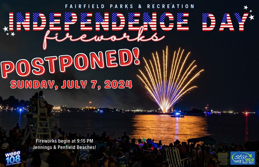 Due to the potential for rainstorms on Saturday, July 6, Fairfield's fireworks display has been postponed to Sunday July 7. Safety is always our top priority in making any decision to postpone. The weather for Sunday is expected to be rain free, and thus a much better day to be on the beaches or on boats on the water viewing the fireworks. Thank you for your support as we keep Fairfielders safe.
