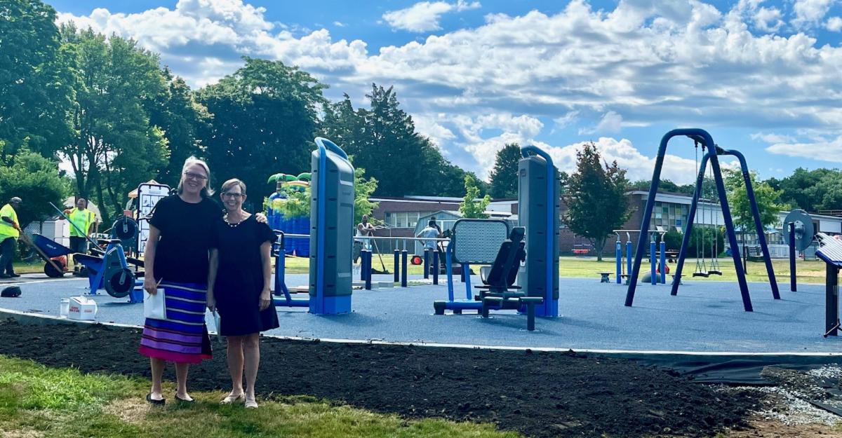 From left: Human and Social Services Director Julie DeMarco and Bigelow Center Director Brenda Steele in front of the new Adult Outdoor Fitness Center, as the Department of Public Works finishes installation. | |