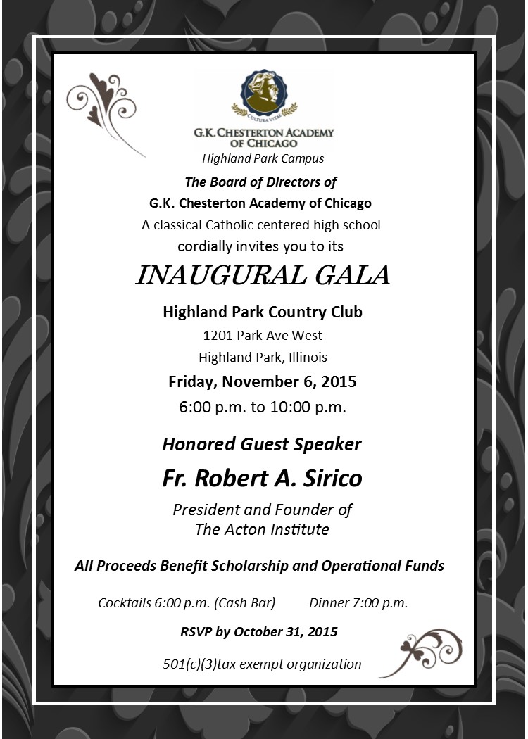 Enjoy an evening of music, food, and conversation arranged by the Inaugural Gala Committee to benefit the scholarship, endowment and operating funds of the GK Chesterton Academy of Chicago.