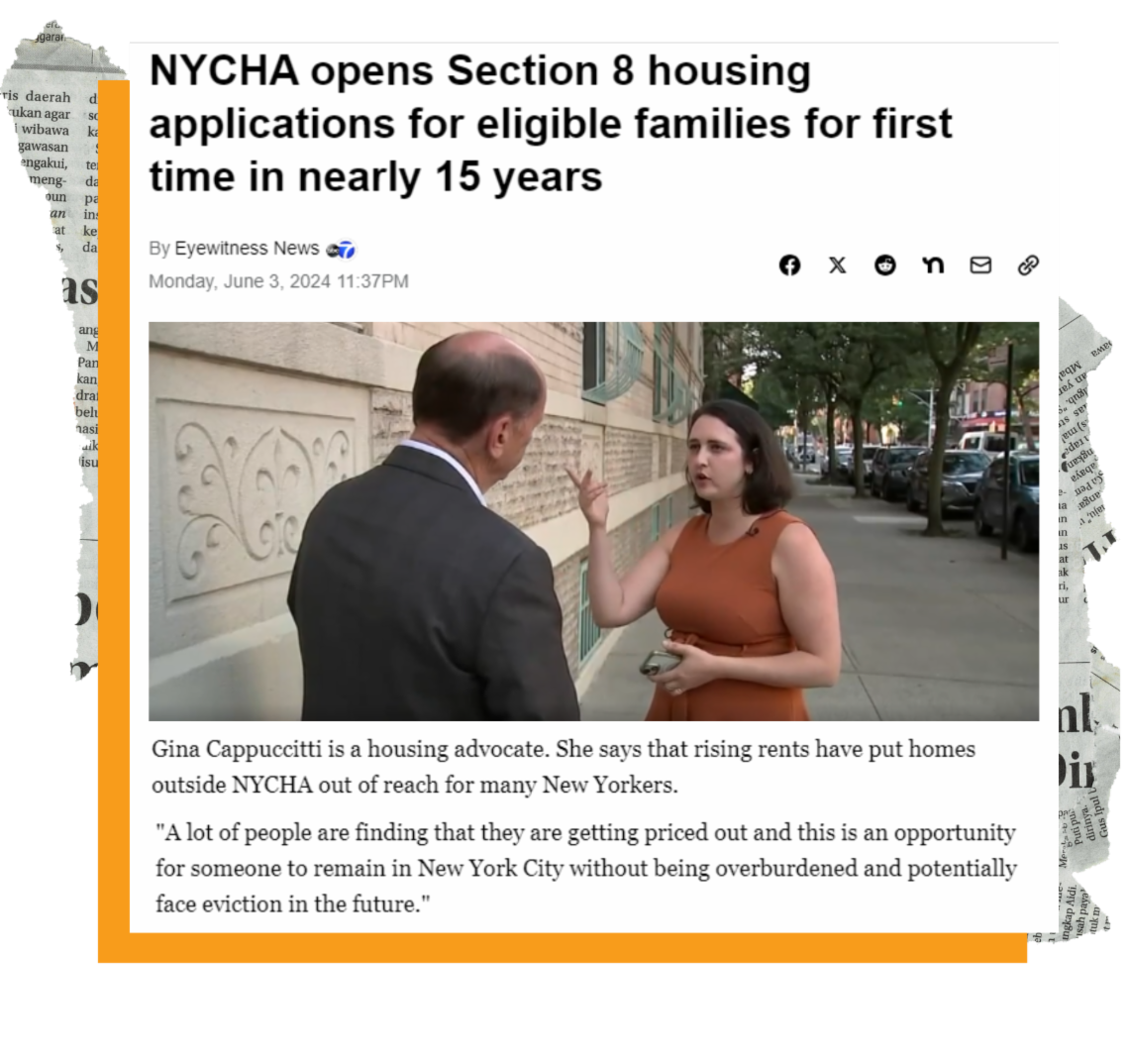 Additionally, our Senior Director of Housing Access & Stability Services, Gina Cappuccitti, spoke with Jim Dolan at ABC7 Eyewitness News about the NYCHA Section 8 waitlist opening for the first time in 15 years. Underscoring the significance of this opening, Gina stated, "this is an opportunity for someone to remain in NYC without being overburdened & potentially face eviction in the future." Watch her interview. | |