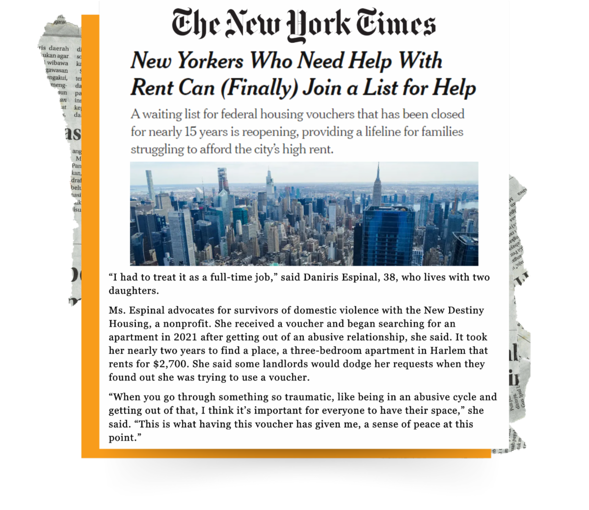 This month, Survivor Voices Project member, Daniris Espinal, spoke with New York Times journalist, Mihir Zaveri, about her housing journey as a rental assistance voucher recipient in New York City. Speaking on her experience, she stated, "This is what having this voucher has given me, a sense of peace.” Read the article here. | |