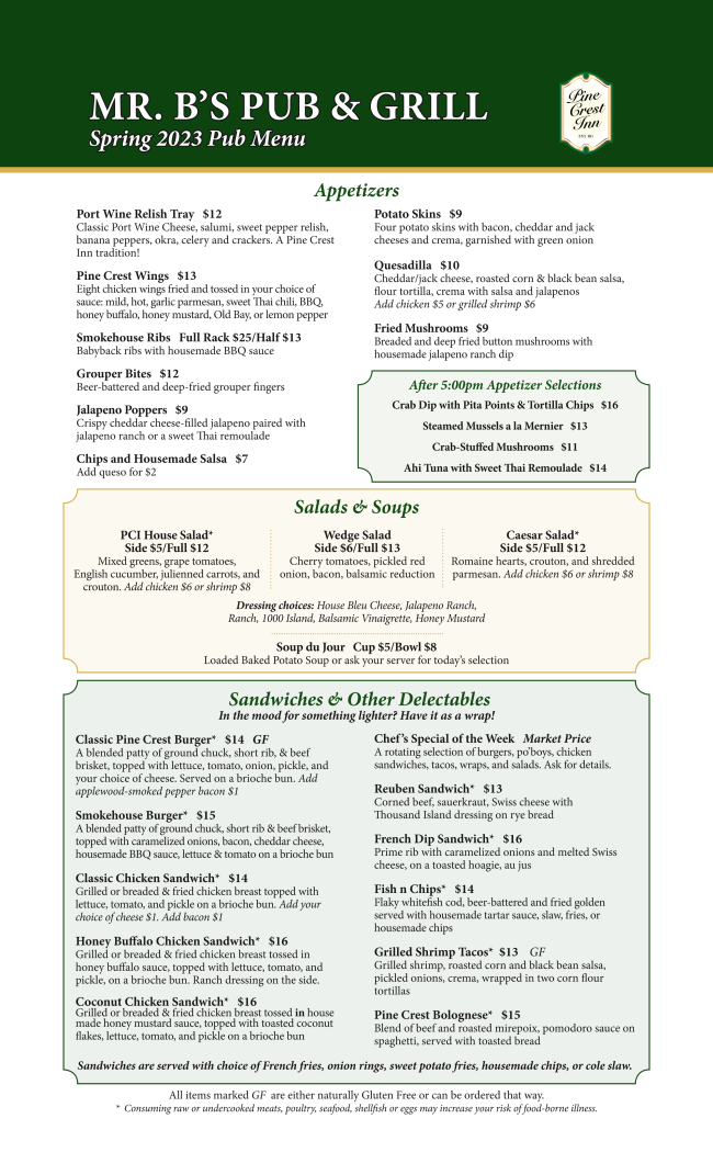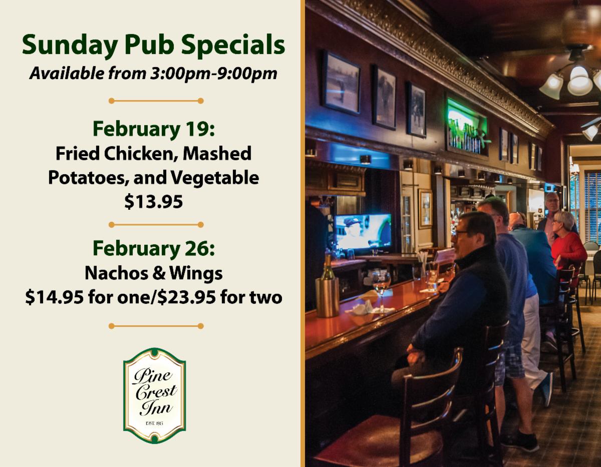 The Pub will be open from 3:00pm until close seven days a week beginning Monday, February 13. Our updated Pub Menu will be available from 3:00pm-9:00pm.