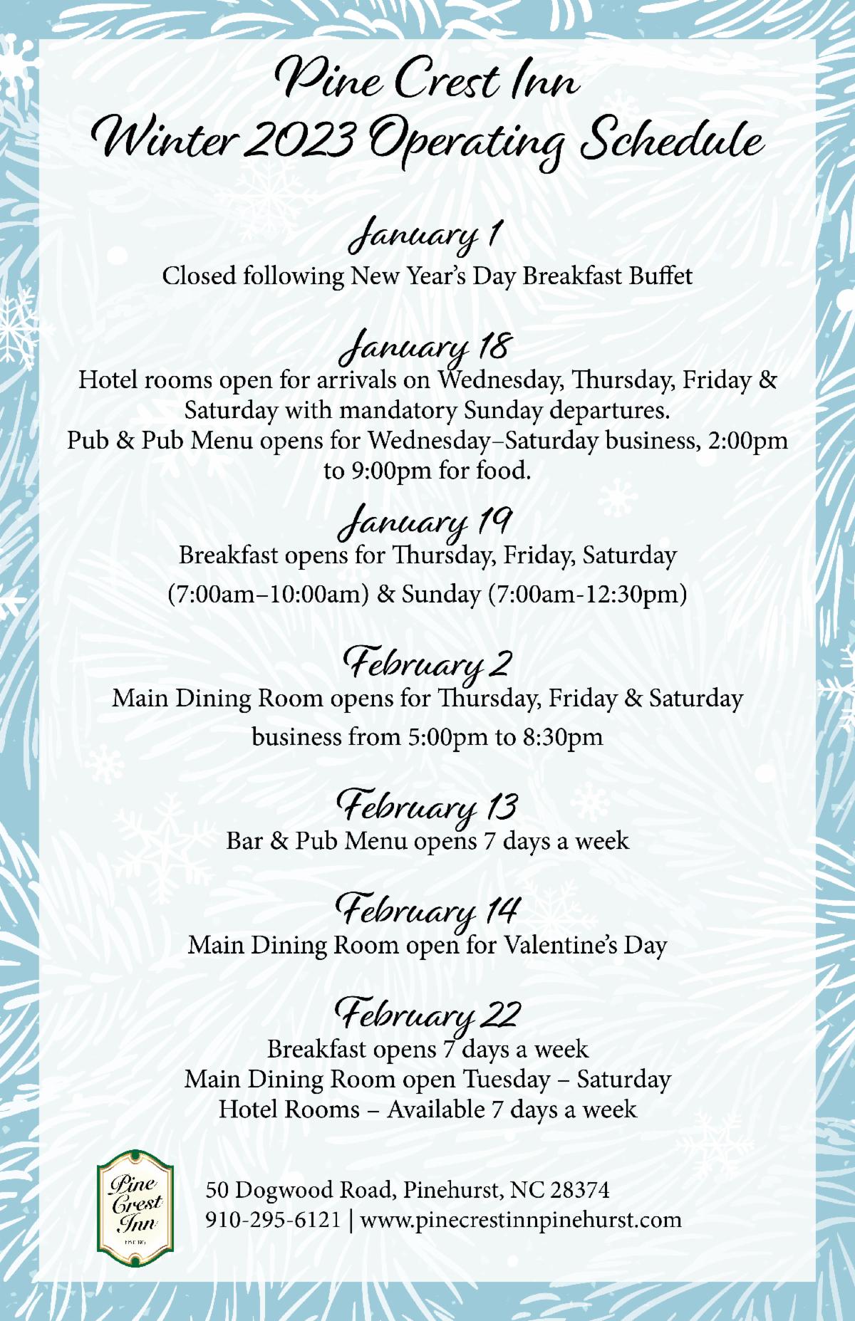 See above for our 2023 winter operating schedule. Click here for a printable version.
