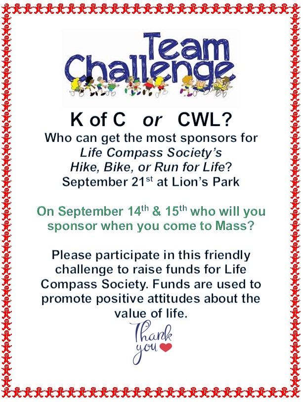 Come out to socialize with your brother Knights to kick off the fall season and help out with our programs including the Walk/Run/Bike for Life, Parish 25th celebrations, Pancake breakfasts, Oktoberfest and COR meetings for men.