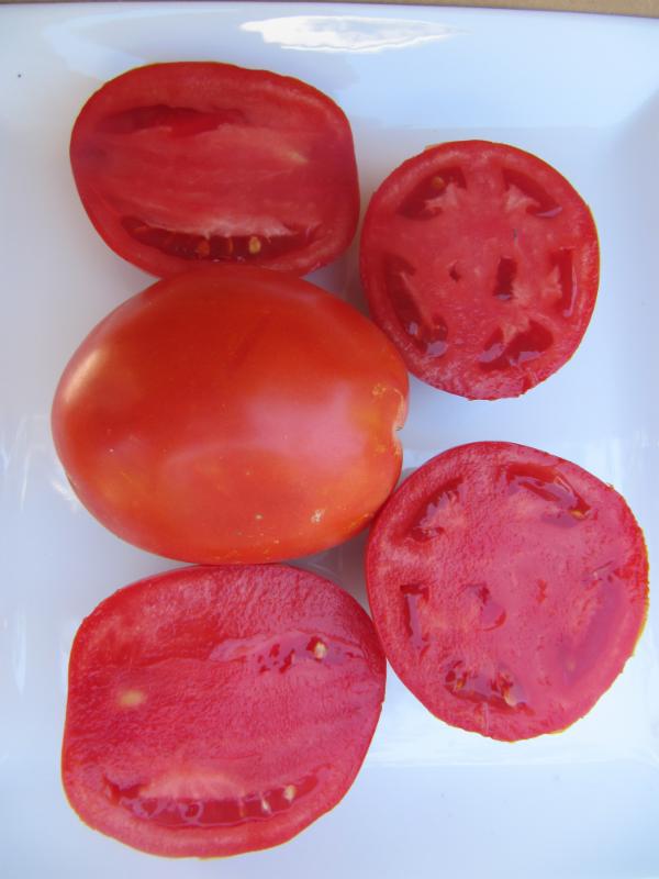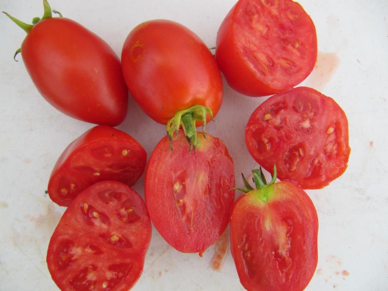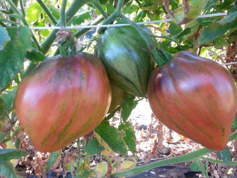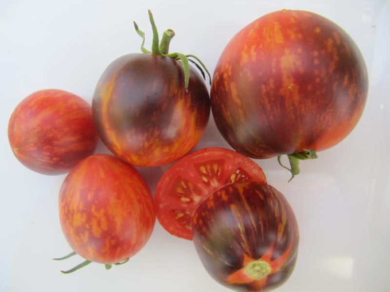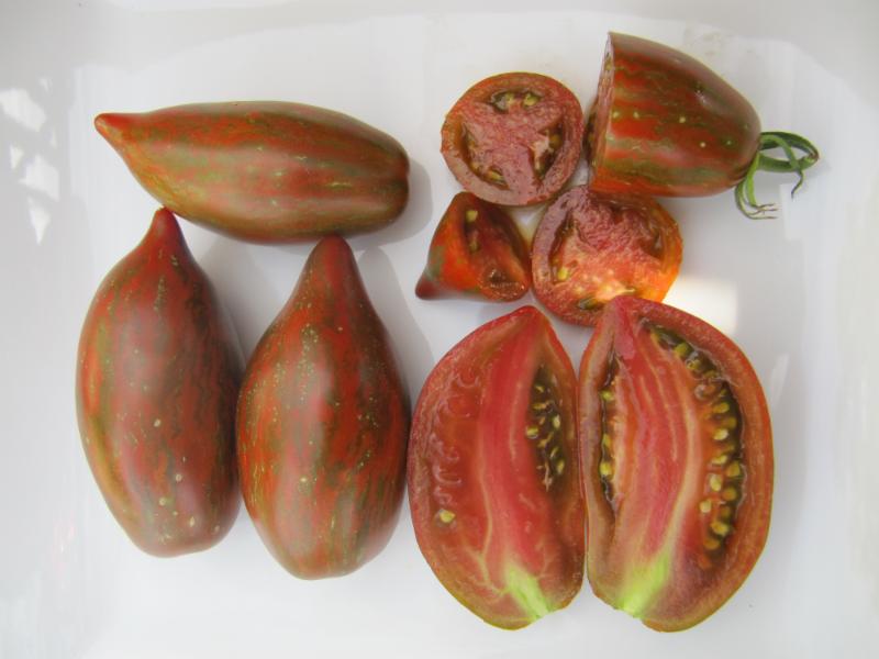 2 - 3 oz. Early-Mid Season. Mahogany-brick pointed roma with green stripes. Very good rich tomato flavor, decent acidity. Meaty flesh. Great production. Like most roma-heart shaped tomatoes, the plant has wispy foliage. Very striking tomato with great flavor. Good for fresh eating plus the potential to make amazingly rich sauce.