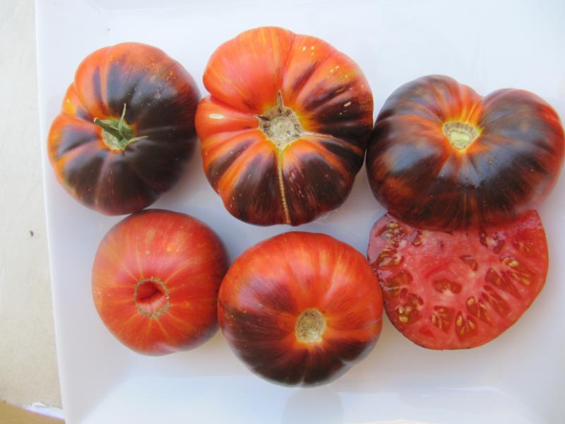 4 - 6 oz. Some larger. Striking red meaty beefsteak with green stripes and purple antho splashes that turn black depending on UV exposure. Allow to fully ripen for great, well balanced old fashioned red tomato flavor. This variety has good hang on the vine ripe ability and great post harvest storage ability. Purchase here:
