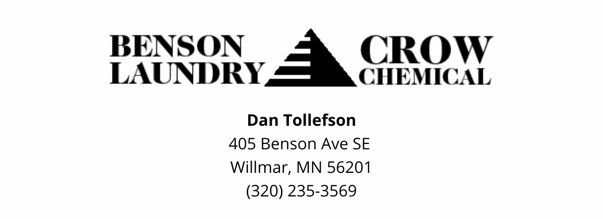 Benson Laundry and Crow Chemical were purchased by Dan Tollefson of Schwegman’s Cleaners in 2022. As one of the fastest growing family-owned industrial laundry services in the state, Benson Laundry can offer even more by partnering with Crow Chemical which offers top quality paper, chemical, and janitorial maintenance supplies. | |