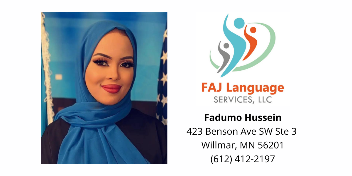 FAJ Language Services LLC provides professional interpretation and translation services to public and private entities including education, e-learning, legal, healthcare, medical, marketing, manufacturing, and media. FAJ Language Services' mission is to bridge the gap and be of great service to the community by offering interpretation services for six languages: Somali, Spanish, Swahili, Karen, Amharic, and Oromo. | |