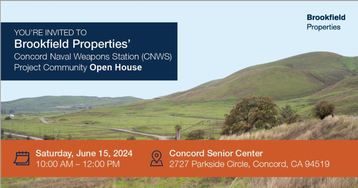Brookfield Properties, the master developer for the Concord Naval Weapons Station (CNWS) base reuse project, is hosting an open house for community members who are interested in learning more about the project and the planning process, and who want to share feedback with the development team.