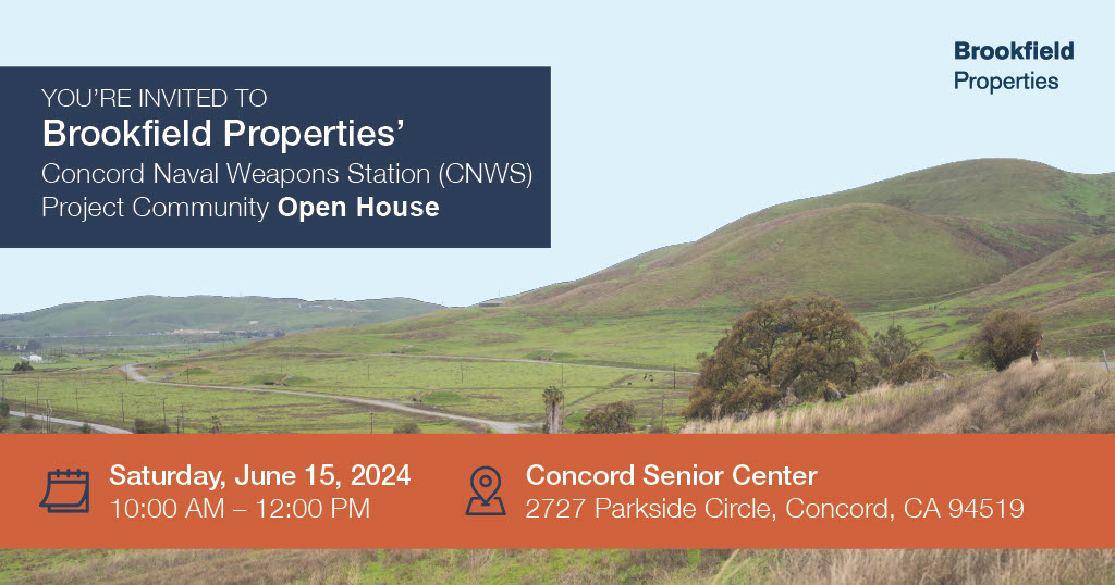 Brookfield Properties, the master developer for the Concord Naval Weapons Station (CNWS) base reuse project, is hosting an open house for community members who are interested in learning more about the project and the planning process, and who want to share feedback with the development team.