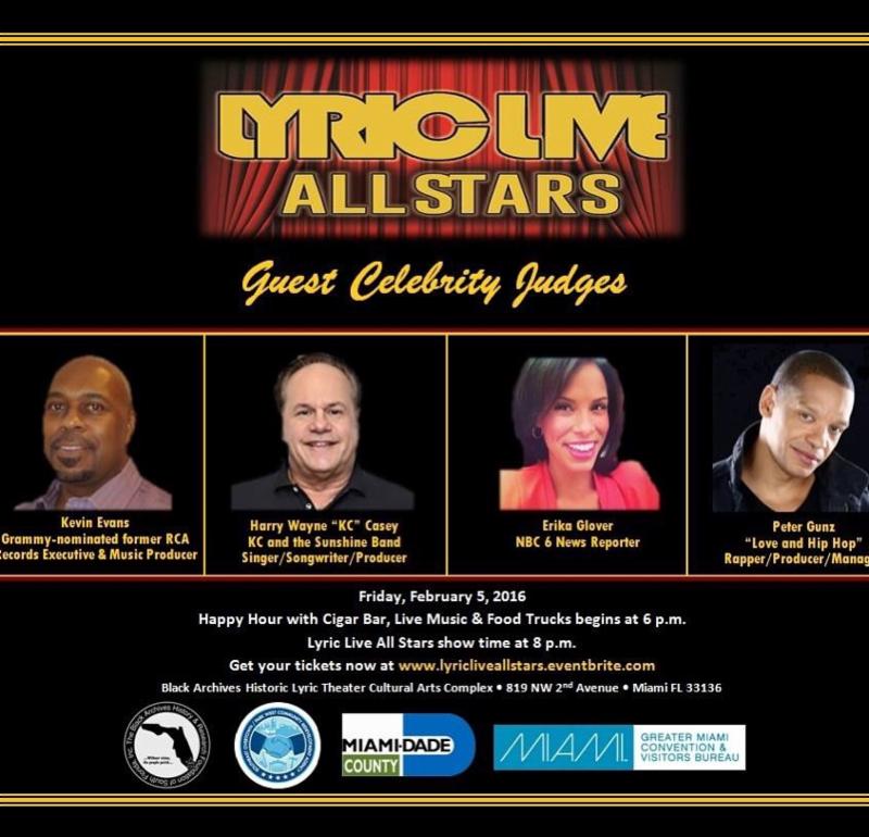 At 6:00 p.m. stroll next door to the Black Archives Historic Lyric Theater Cultural Arts Complex,located at 819 NW 2nd Avenue, for Lyric Live. Lyric Live is an Apollo themed talent showcase where you get to boo or applaud your favorite contestants .This month the Black Archives presents,Lyric Live All Stars,a special edition of Lyric Live , featuring the season's winners competing for the grand prize.Special celebrity guest judges will include : Grammy-nominated record executive Kevin Evans; Harry Wayne from KC and the Sunshine Band, Erika Glover ,reporter for NBC 6 News and rapper Peter Guns of "Love & Hip Hop New York".