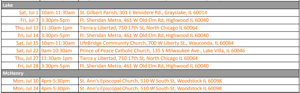 See below fore the Lake and McHenry County locations and times, or click to see other counties.