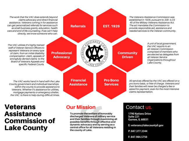 Accuracy is important to us. if you believe an error has been made, please email the Lake County Veterans Assistance Commission at veterans@lakecountyil.gov. Use of social media does not imply endorsement on the part of the VAC. Content on these sites is not edited for accuracy and may not necessarily reflect the views of the VAC.
