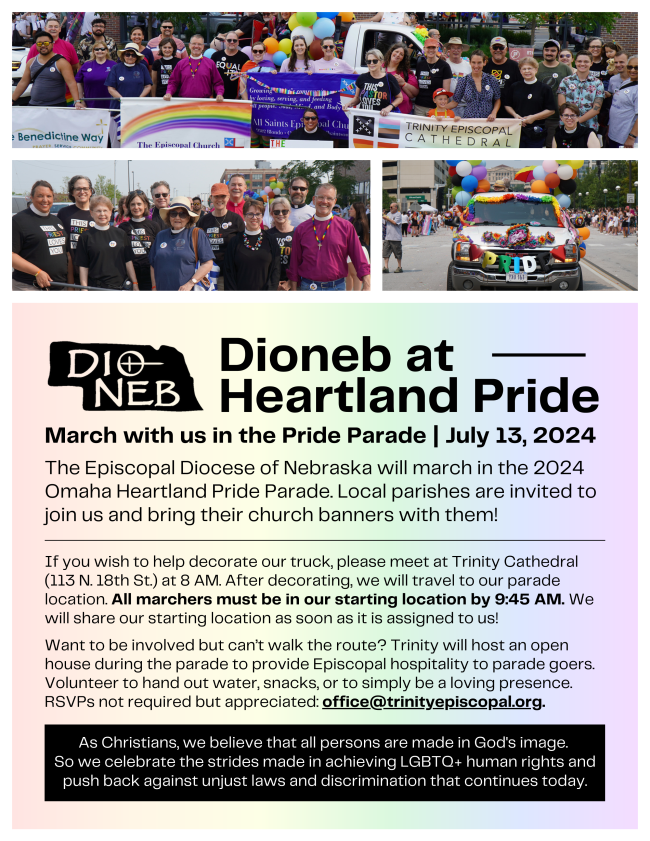 As Christians, we believe that all persons are made in God's image. So we celebrate the strides made in achieving LGBTQ+ human rights and push back against unjust laws and discrimination that continues today. This June, consider learning about milestones in the Gay Rights Movement like the 1969 Stonewall Uprising. You may wish to join in Pride celebrations across the state, or get involved in a LGBTQ+ resource organization like OutNebraska. DioNeb will have a presence at Omaha Heartland Pride on *July 13, learn more here.