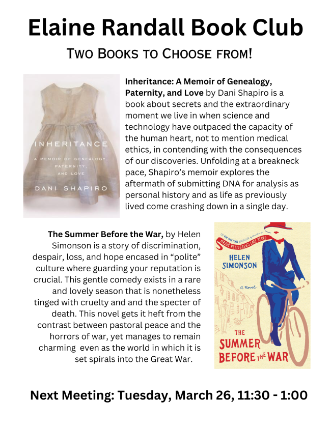 The Elaine Randal Book Club meets once a month on Tuesday's at 11:30 AM. All are welcome! The books to read for the March meeting are Inheritance: a Memoir of Genealogy, Paternity, and Love by Dani Shapiro and The Summer Before the War by Helen Simonson. There are Book Bags in the Parish Hall. Please Contact Rhonda or Nancy for questions.