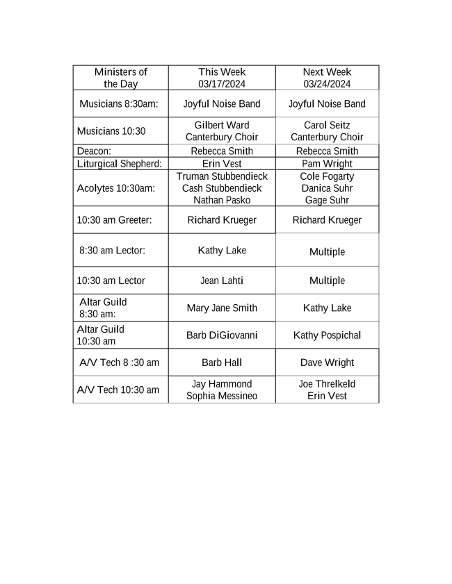 Our February Vestry meeting was a chance to welcome our new members, Barb DiGiovanni and Hannah Early. We re-elected Maggie Wellman as our treasurer for the year and elected Jean Lahti to serve as clerk for the February meeting. Bishop Barker greeted us and was very encouraging of our growing and active parish. The Vestry spent time reviewing our financial statements in detail and discussed our communications with the City of Omaha about a small sinkhole that has appeared in the public right of way northwest of our space. We are planning for a vestry retreat in March to discuss our major goals and projects for the year.