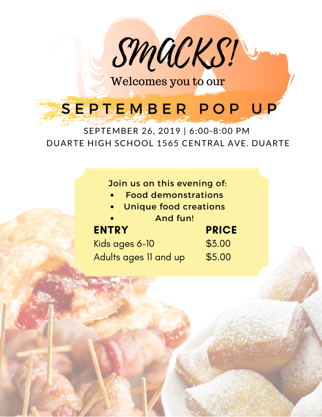 The students in Duarte High School's Academy of Culinary Arts Entrepreneurship are hosting their first very first Pop-Up event. Don't miss the opportunity to taste for yourself the culinary delights cooked by Smacks! who are the students in Grades 11 and 12 who have been learning both the creative and business sides of the culinary field from instructors Chef Prince and Amy Bustos. This first Pop-Up will include student demonstrations of items they have made throughout their training. Guests will get to experience the process of making these great products as well as taste their creativity! The September event is a soft-open of the experience the students will be holding monthly. Join them at the Culinary Arts Complex located on the campus of Duarte High School this Thursday, September 26, from 6:00 p.m. -8:00 p.m.